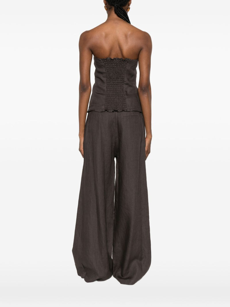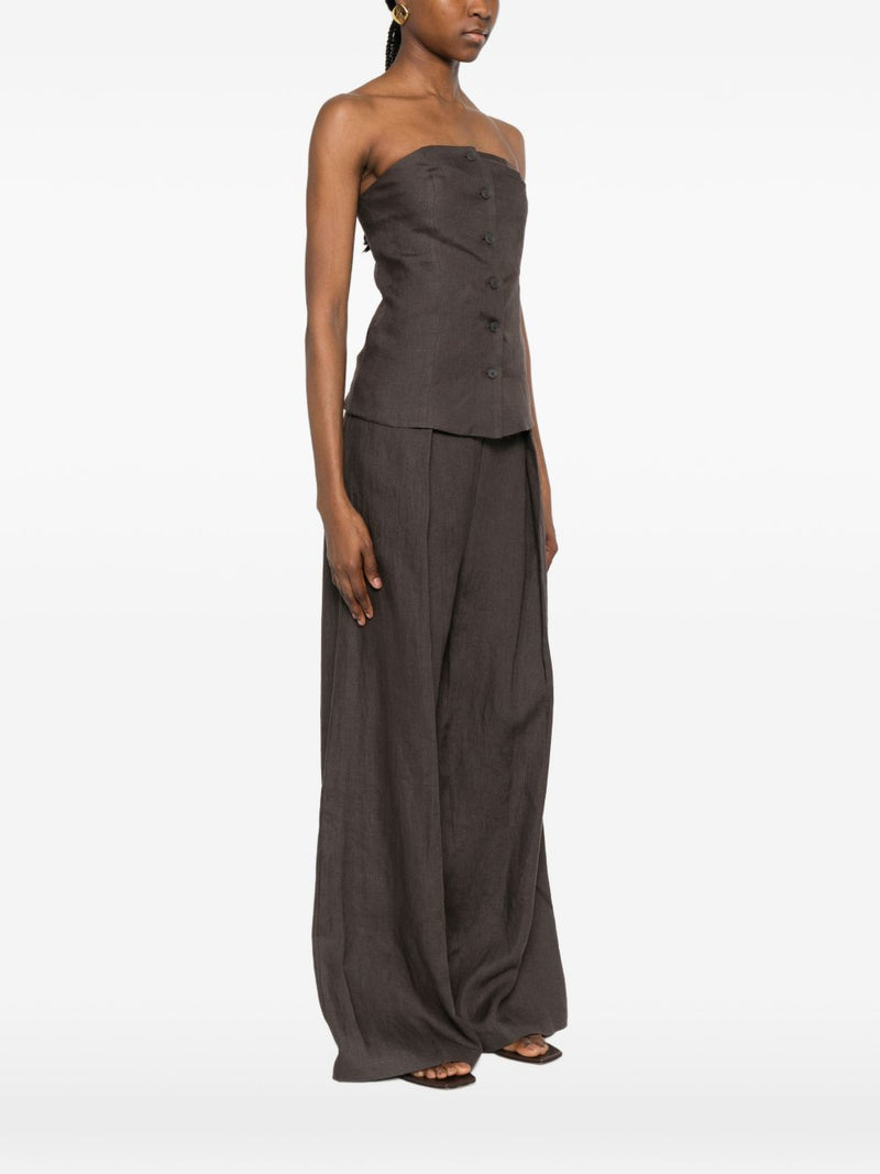 Il bustier marrone da donna su valorizza la silhouette con una linea asciutta e un design essenziale. Il modello è senza spalline, con davanti strutturato e abbottonatura centrale che dona un aspetto pulito e contemporaneo.